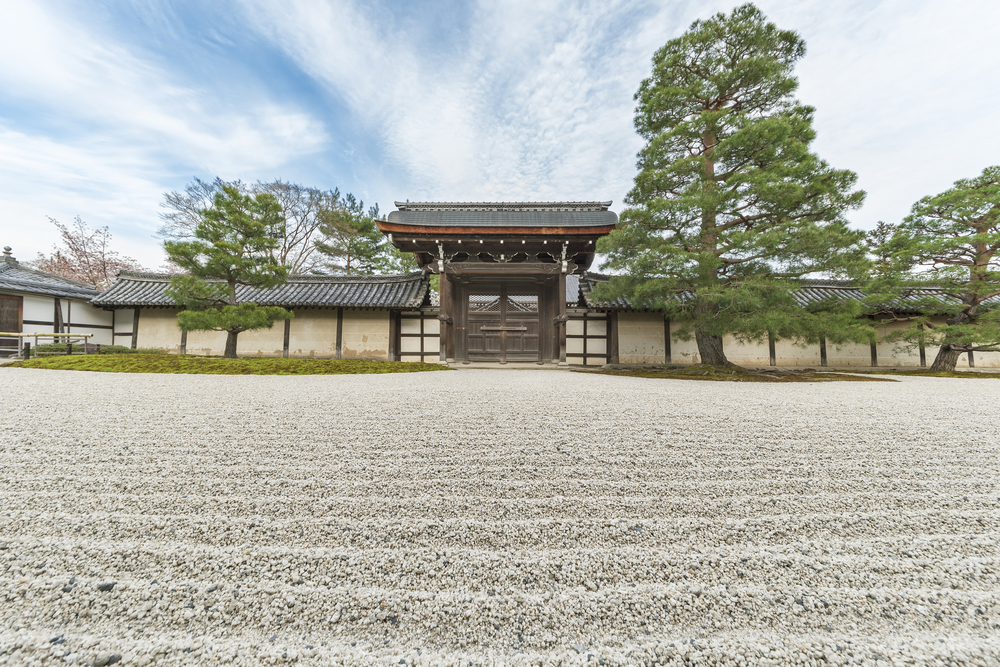 Garden with pond in front of Tenryu-ji Temple at Arashiyama, Kyoto, Japan