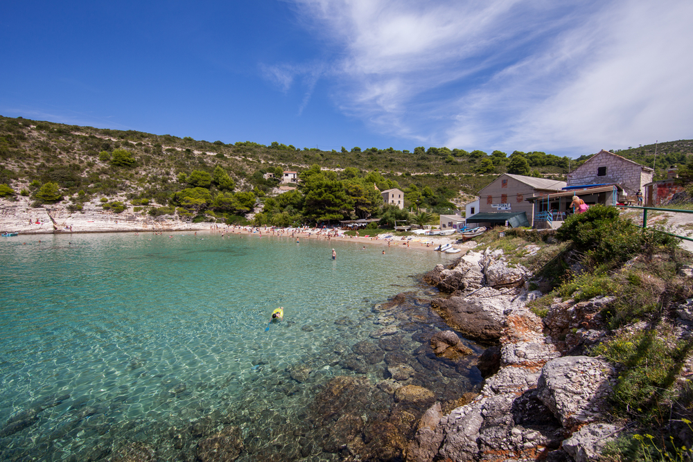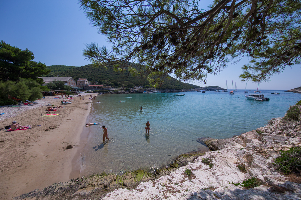 BISEVO, CROATIA – JUL 29, 2016: Porat is a sand beach located on the Bisevo Island. In 2011, The Irish Times counted it as one of the top 7 beaches in the world (in terms of natural beauty).