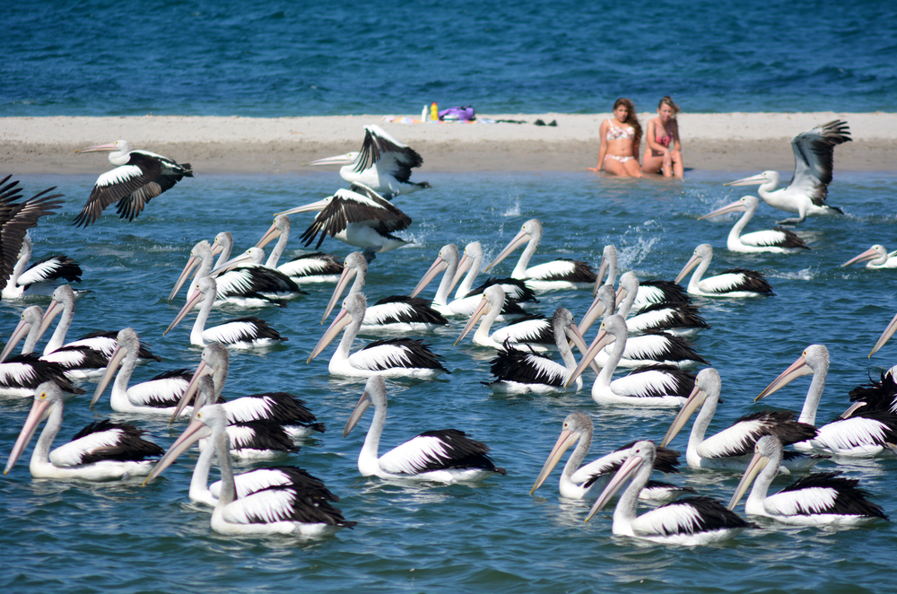 GOLD COAST, AUS – SEP 30 2014:Young Australian woman looks at Pelicans at Labrador Gold Coast , Australia.Pelicans are the largest flying bird in Australia. (ChameleonsEye / Shutterstock)