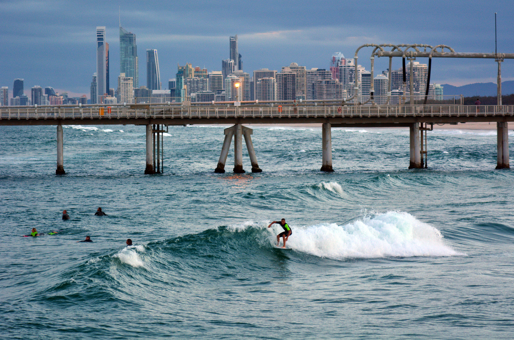 GOLD COAST – OCT 10 2014: Surfers in the Spit beach.It is a very popular surfing beach in Surfers Paradise Gold Coast Queensland, Australia. (ChameleonsEye / Shutterstock)