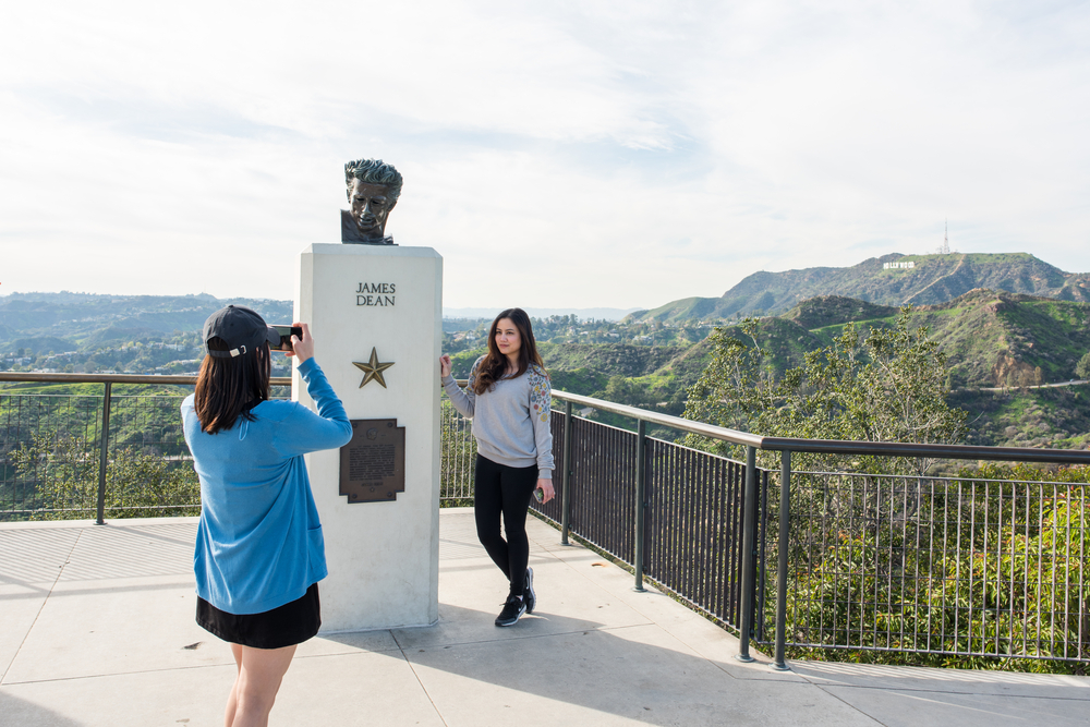 Los Angeles, CA: February 13, 2017: James Dean bust with Hollywood sign in the background. The Griffith Park Observatory is a popular destination for tourists, with millions visiting each year.