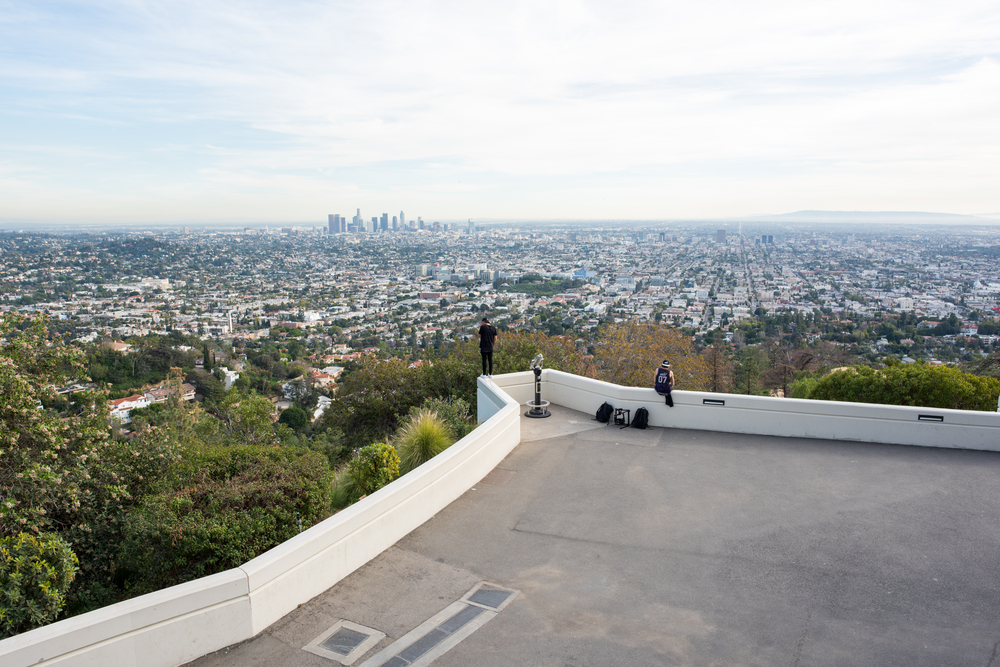 Los Angeles Griffith Park and Downtown LA skyline in the distance.
