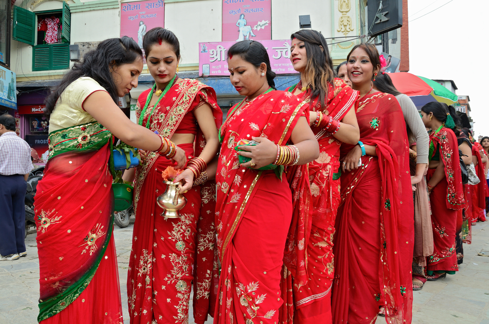 Kathmandu, Nepal – September 18, 2012: Hindu women in traditional red sari celebrating the Haritalika Teej festival on the streets of Kathmandu, Nepal (eAlisa / Shutterstock)