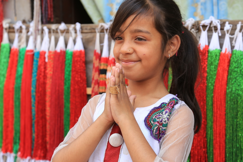 Kathmandu, Nepal- Nepalese young girl hands together to do namaste on April 18, 2014 (Soultkd / Shutterstock)