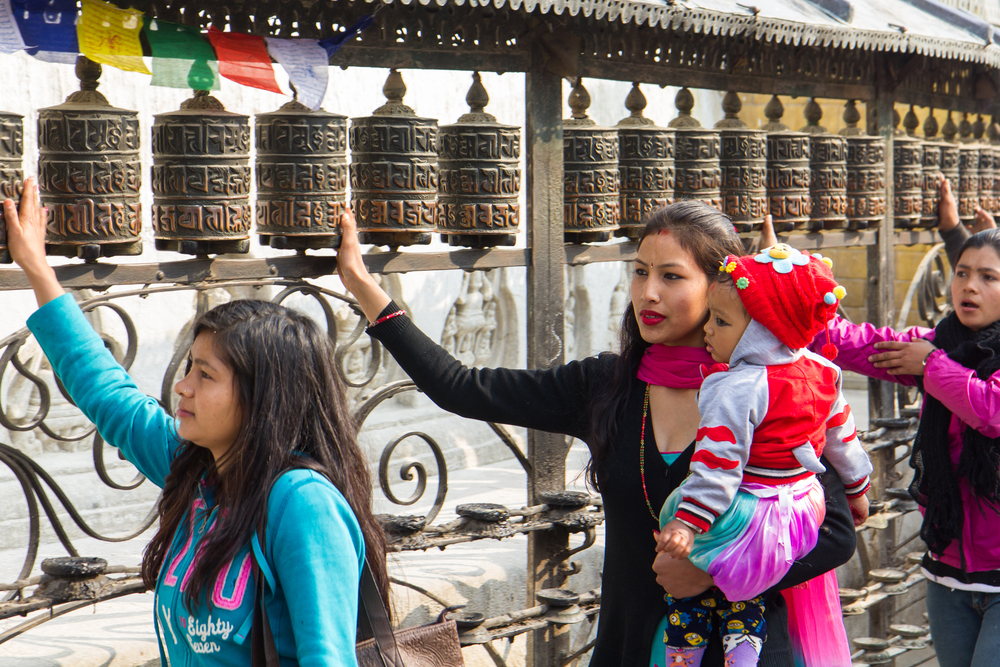 KATHMANDU, NEPAL – FEBRUARY 27, 2016: Locals use prayer wheels at Swayambhunath temple. (Pat Nomad / Shutterstock)