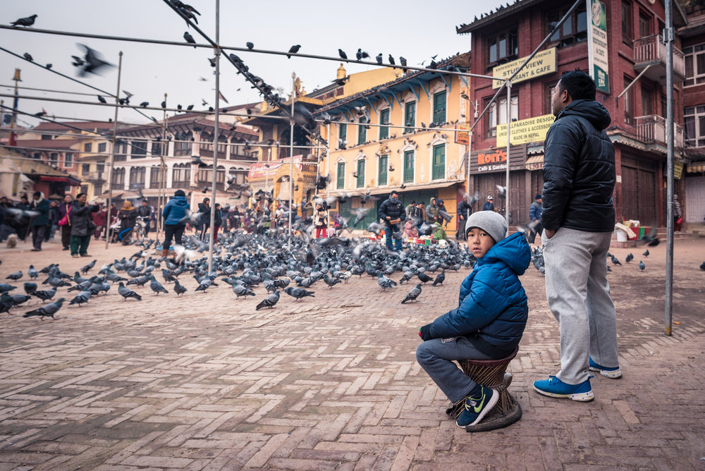 KATHMANDU, NEPAL – DEC 18, 2015: Unidentified nepalese small boy sit and enjoy near Boudhanath Stupa in Kathmandu, Nepal., Boudhanath is one of the largest ancient stupa in the world (Panom / Shutterstock)