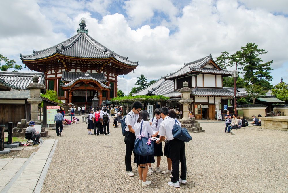 NARA, JAPAN – JUNE 27, 2015: Japanese students in Kofukuji temple Nara, Japan (Lerner Vadim / Shutterstock)