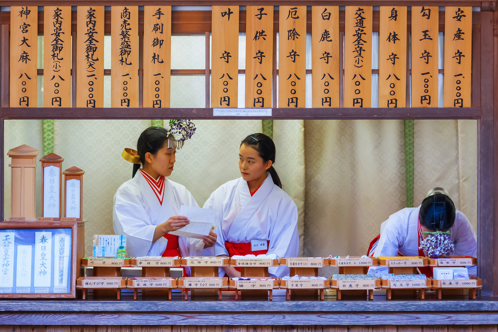 NARA, JAPAN – NOVEMBER 16: Shrine maiden in Nara, Japan on November 16, 2013. Unidentified “Miko” at Kasauga Taisha shrine are in a counter selling wide variety of charms that made by the shrine (cowardlion / Shutterstock)