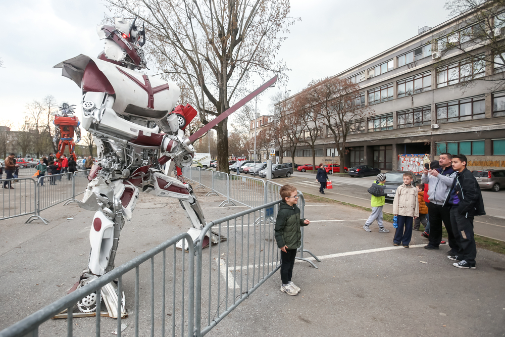ZAGREB, CROATIA – MARCH 26, 2016 : Exhibition by Danilo Baletic (23) named Transformers protecting Zagreb on square Franje Tudjmana in Zagreb,Croatia. Exhibition is made of automobile parts and waste. (Photoman29 / Shutterstock)